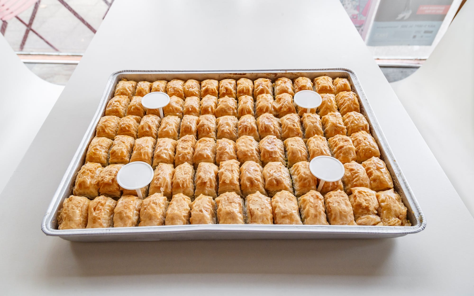 A rich, sweet dessert pastry made of layers of filo filled with chopped nuts and covered in honey.