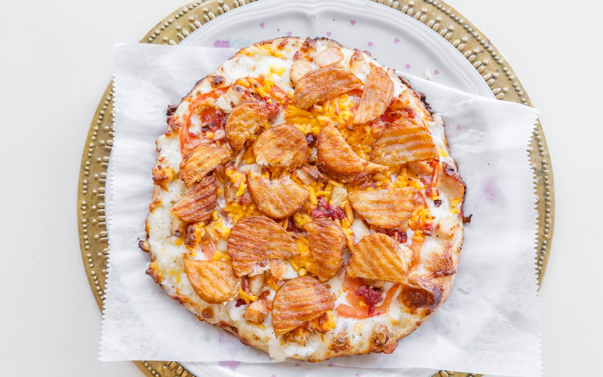 Thin crust, boiled potatoes, onions, 3 cheese blend & spices served with fresh Italian parsley & onions on the side.