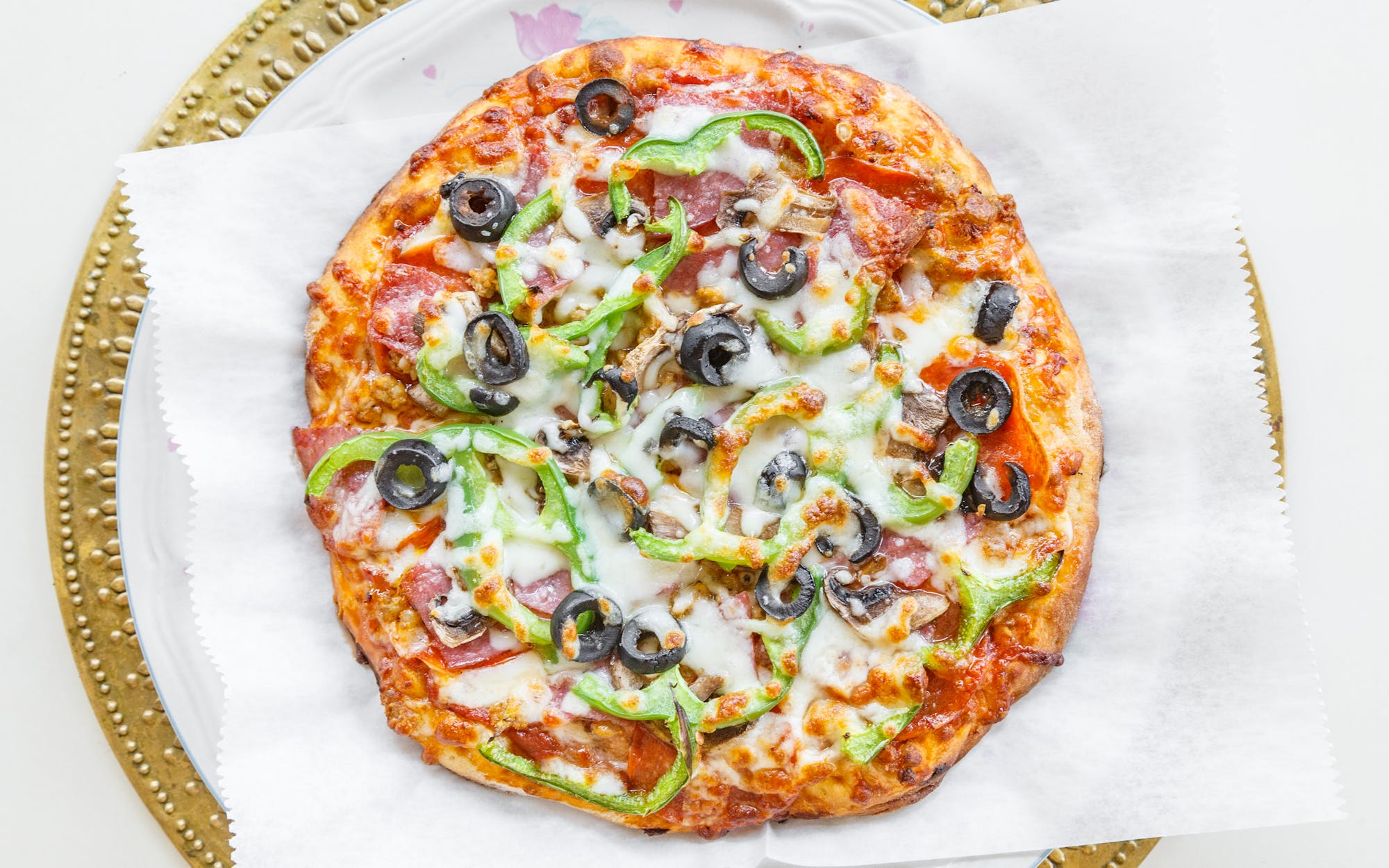 Hot sausage, pepperoni, salami, black olives, green peppers & mushroom with red sauce